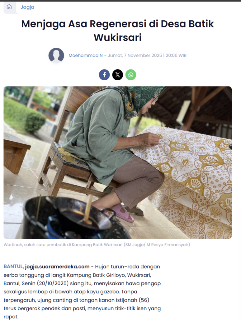 Link tulisan: https://jogja.suaramerdeka.com/jogja/1816216895/menjaga-asa-regenerasi-di-desa-batik-wukirsari?page=all